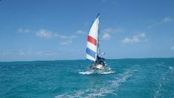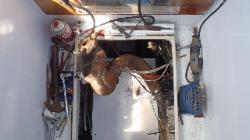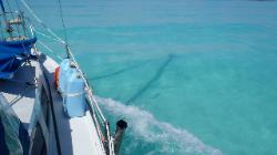 Cay, à 18 mn. A 5Mn de l'arrivée, je remarque que la pompe de cale fonctionne, je vais voir dans le bateau, retire une des trappes d'accès du plancher et horreur, de l'eau chaude partout... je retire l'échelle donnant accès au moteur et je trouve assez facilement la cause... Nous arrêtons le moteur et nous appellons Franc Nord sur la radio VHF pour l'informer du problème. Nous metterons donc l'ancre au millieu de la mer des Abaco dans 17 pieds d'eau et 3 à 4 pi de vagues ainsi que FrancNord le temps de faire une réparation de fortune qui prendra 2 heures environ. C'est le collecteur d'eau de refroidissement du moteur qui s'est détaché du moteur laissant giclé l'eau chaude de refroidissement du moteur dans la cale. |
