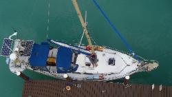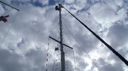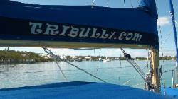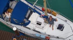 mars, comme je dis souvent il n'arrive jamais rien pour rien et en faisant ses vérifications, Normand remarque que son feu de navigation en tête de mât ne fonctionne pas, il profitera donc de la tranquilité de la marina pour le changer et aussi de prendre quelques belles photos de la marina et de Tribull à 42 pieds dans les airs... Nous irons aussi prendre un bon souper au restaurant tout près avec vue sur la mer des Abaco... |