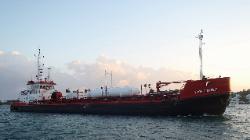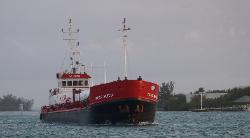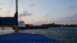 Franc Nord qui sont ancrés non loin de nous nous appelle sur la VHF pour nous dire qu'un gros cargo se dirige vers nous. Comme il y a plusieurs bateaux, il font du slalom entre nous pour se rendre au quai où il vont faire la livraison de propane et de pétrole. On le regardent près de nous avec un peu de surprise. Il remue le fond de temps à autre car il laisse une trace trouble de sable derrière lui. On se dit qu'ils doivent être habitués en espérant qu'il ne touchera pas à notre ancre ... tout se passera bien |