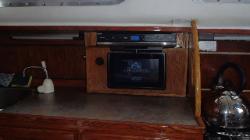 aspects table pliée et dépliée, télé, chauffe-eau... C'est dans cet espace de 7pi sur 8pi que nous vivons quand on est sur le bateau, il y a bien sure en plus la couchette avant et le cockpit... |