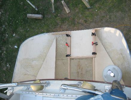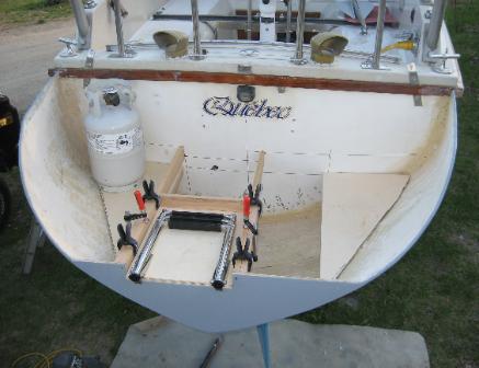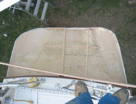 on voit les premières lignes servant à positionner la structures des futurs coffres. Les alvéoles losangées ont été également comblé avec la pêtes d'époxy West Systems. 2 couches de toiles seront ajouter afin de compléter la coque intérieure. |